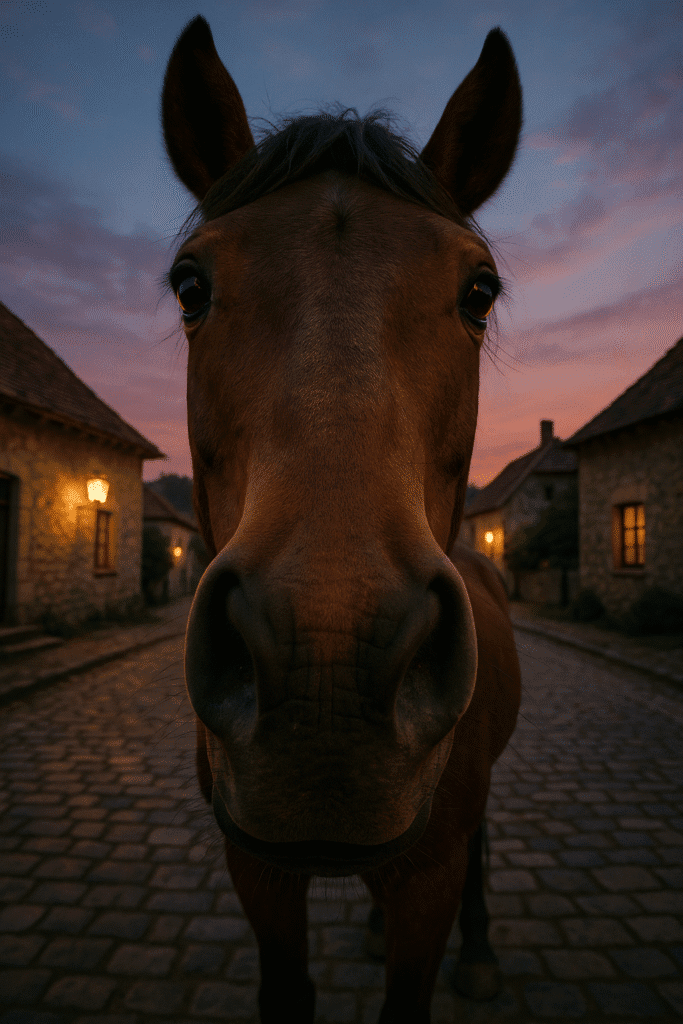 A hyper-realistic, wide-angle close-up of a curious horse with its nose nearly touching the camera lens. The horse’s face fills most of the frame, with large, shiny amber eyes and detailed fur texture clearly visible. Its snout appears slightly exaggerated due to the lens distortion. The background shows a small, peaceful Romanian village at dusk, with cobblestone streets, warm streetlights, and classic stone cottages. The atmosphere is calm and slightly magical, with early evening sky hues and soft lighting illuminating the horse and the surrounding scene. No people are visible. The horse appears inquisitive and gentle, standing still as if studying the viewer., Cinematic